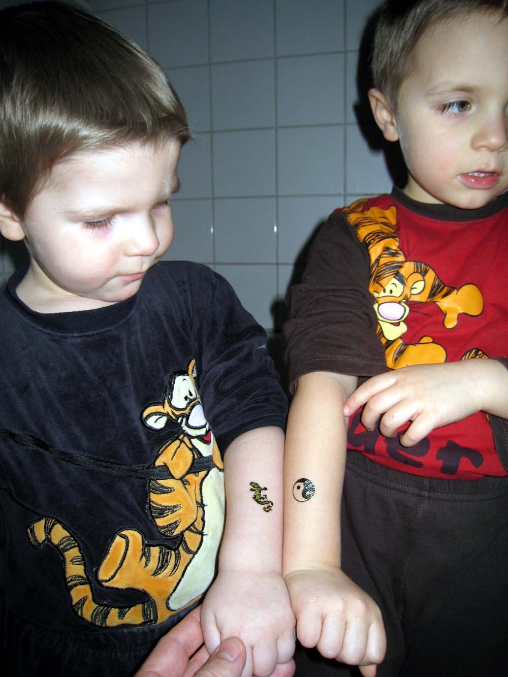 · Vormittags war ich im Kindergarten - nachmittags ein Schläfchen und ein bisserl alte Kindervideos am PC anschauen - sonst nix aufregendes. · Morgen gibt der Michi seine erste Vorstellung im Kindergarten - er spielt da einen Angsthasen - manchmal trifft das ja auch zu ;) · Vor dem zu Bett gehen hat uns die Mama noch die ursuper Tattoos gemacht! |