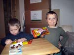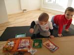 · Es ist geschafft! Wir haben die Wohnung in Simmering fix fertig vorbereitet, somit kann da am 21. die große Möbellieferung antanzen. · Wenn es dann eingerichtet auch nur halb so lustig ist wie jetzt, dann werden der Michi und ich viele Stunden bei der Oma verbringen. Wo die Küche ist und wo gegessen wird, das wissen wir nun ja schon mal ;) · Um den Abschluss gebührend zu feiern, ging es dann in die Pizzeria Assiusi. Das wird wohl die neue Stammpizzeria werden. Jedenfalls haben die einen schönen Wintergarten, dort war es schön warm und so ist der Michi nach dem Essen in Mamas Armen eingeschlafen und konnte erst daheim wieder geweckt werden. · Am Nachmittag hat mir der Papa nun doch auch noch einen Flugsaurier besorgt - einen Quetzalcoatlus im Maßstab 1:40 - der ist viel cooler als der Anhanguera vom Michi - und das merkt man meinem Bruder auch ein bisserl an ;) · Da ich unter Tags nicht geschlafen habe, war ich am Abend schon furchtbar grantig und ging früh ins Bett. Dadurch war der Weg frei für die "Großen" um in Ruhe eine Partie Monopoly Junior zu spielen. Ergebnis: Michi hat gewonnen, Papa hatte die meisten Fahrgeschäfte und Mutti war pleite :) · Bevor wir dann ins Bett gingen, haben wir noch schnell unser Geschenk für morgen eingepackt - dabei hat sich mein Bruder das Papier und das Band ausgesucht. |