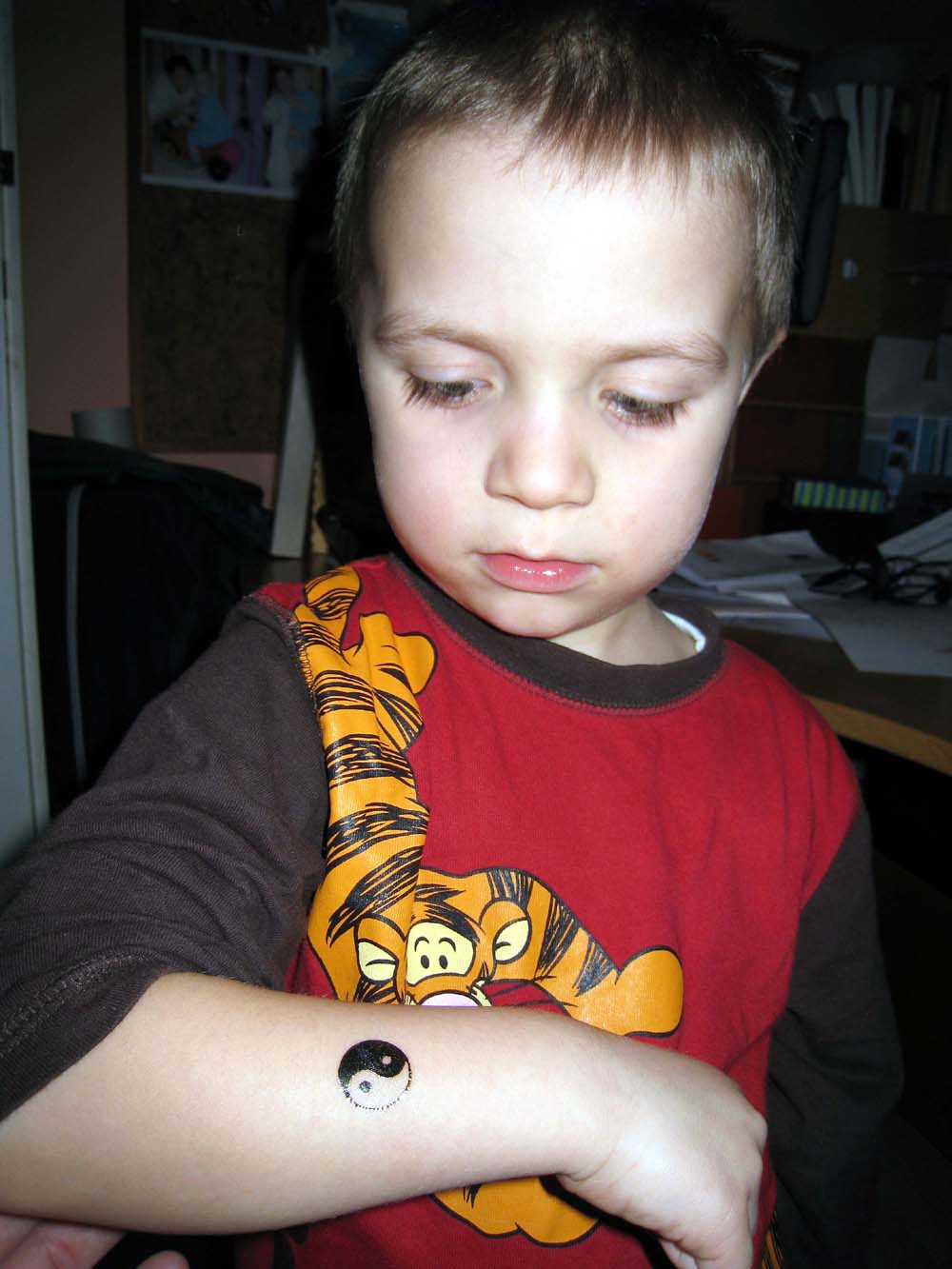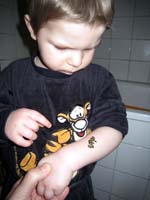 · Vormittags war ich im Kindergarten - nachmittags ein Schläfchen und ein bisserl alte Kindervideos am PC anschauen - sonst nix aufregendes. · Morgen gibt der Michi seine erste Vorstellung im Kindergarten - er spielt da einen Angsthasen - manchmal trifft das ja auch zu ;) · Vor dem zu Bett gehen hat uns die Mama noch die ursuper Tattoos gemacht! |