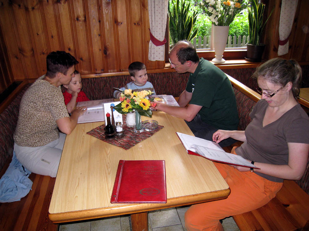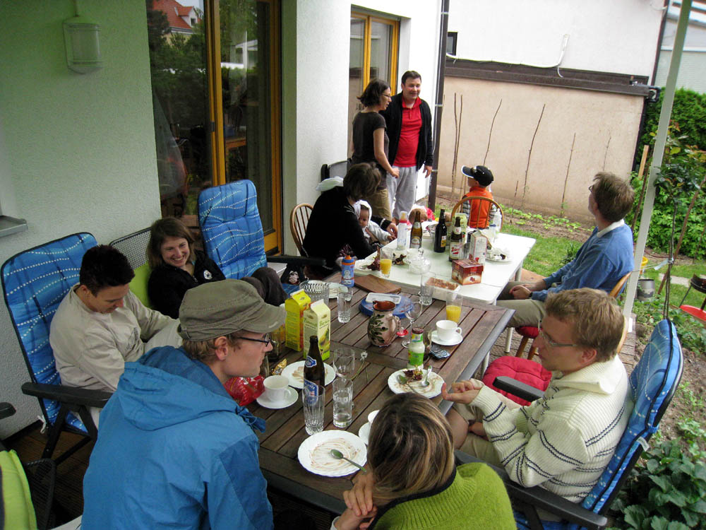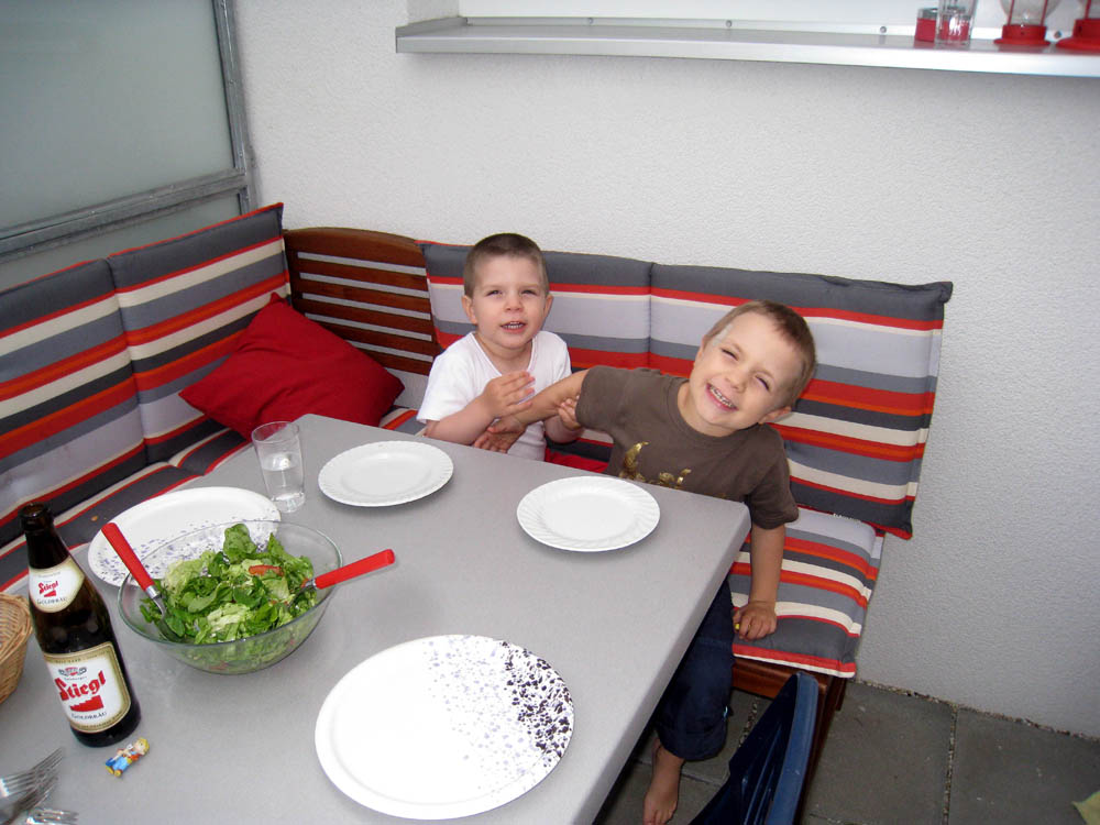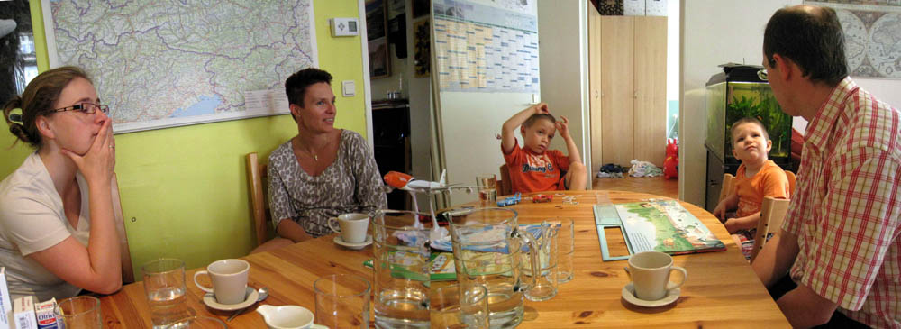· Den Vormittag haben wir heute alle verschlafen, weil Papa mit Onki und Tante noch länger auf war und der Michi und ich auch sehr müde waren. · So gab es statt dem Mittagessen gleich ein zweites Frühstück auf Omis Terrasse. Und weil der Onki ja Inschinör und gelernter technischer Zeichner ist, haben wir heute die Endkontrolle von Omas Wohnung durchgeführt. · Er war sehr zufrieden und die Oma damit auch :) Außerdem wollte er dem Papa gleich die zwei freinen Wohnungen im Nachbarhaus geschmackig machen - das ist nach der Ansicht der Wohnungspläne und der Preisvorstellungen der Genossenschaft aber schnell gestorben :) |