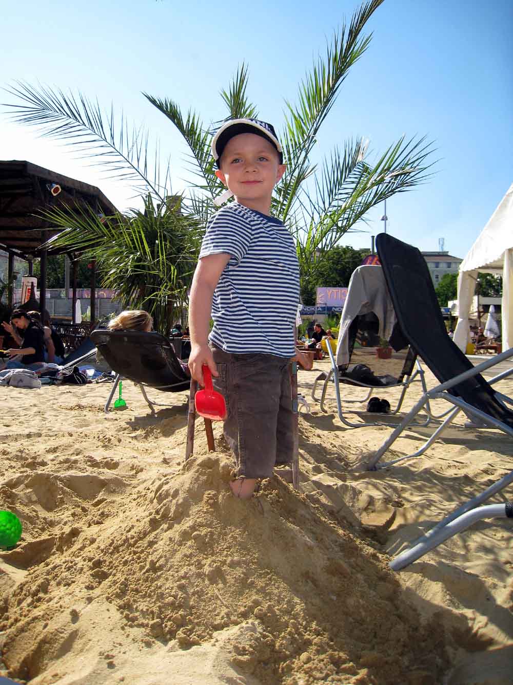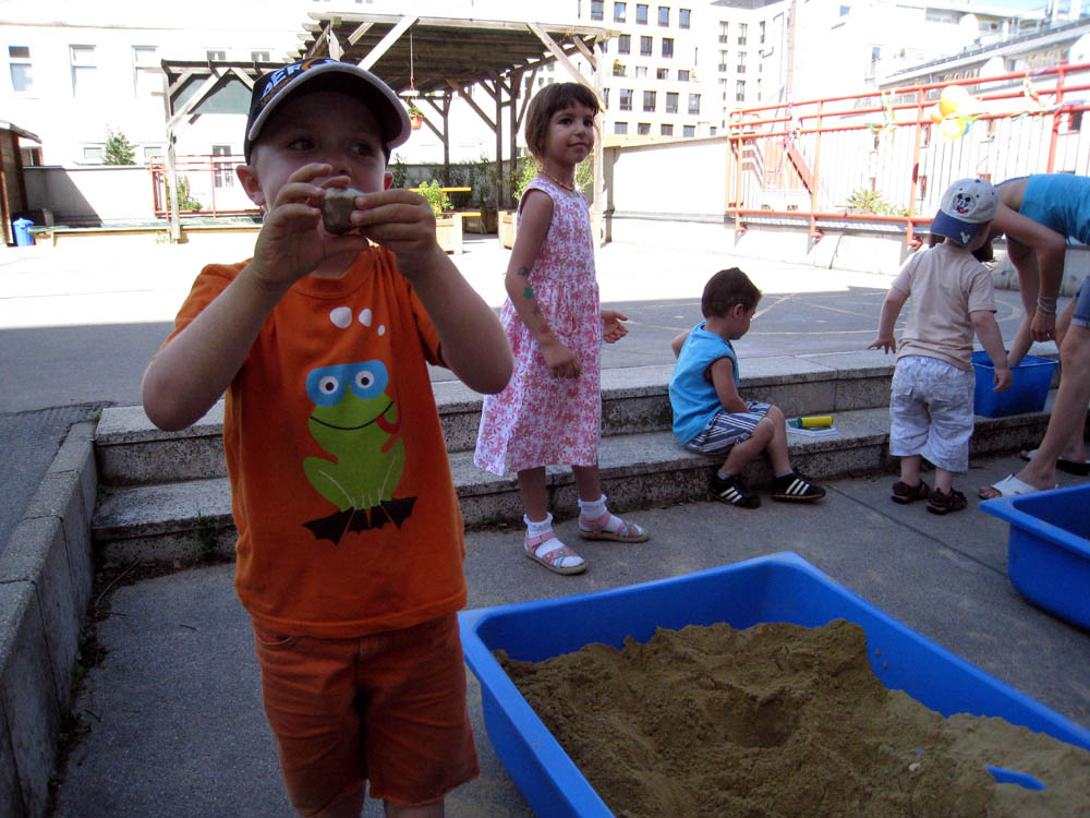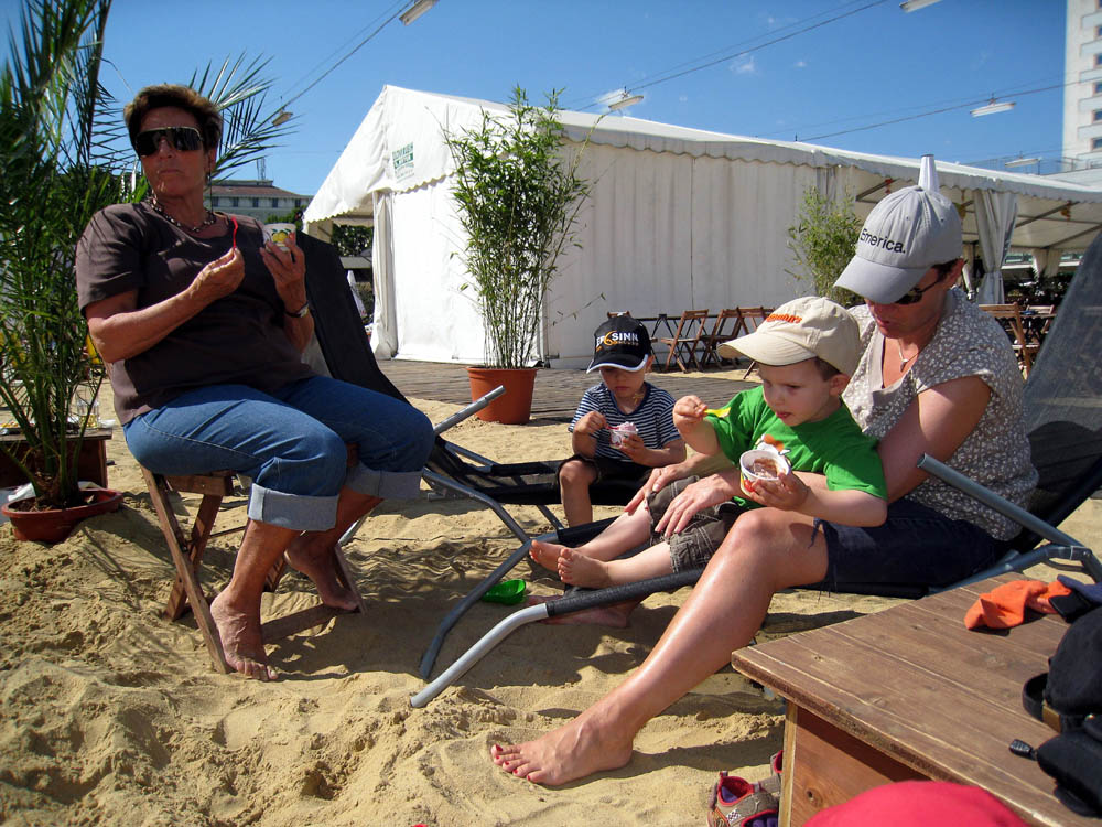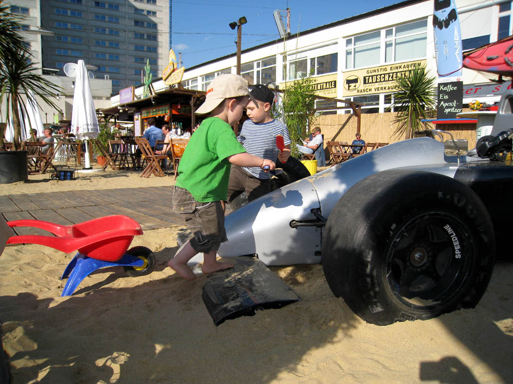 · Nach so einer anstrengenden Wanderung durch den Wienerwald war heute zuerst einmal eine Auffüllung der Reserven - mit feinstem Schitzi - und anschließend Erholung angesagt. · Zu diesem Zwecke haben wir mal die Alternative zum Herrmannstrand erkundet und waren bei Sand in the City am Gelände des WEV. Der macht erst um 14 Uhr am Nachmittag auf und wird am Abend zur Partyzone von Schicki und Micki ;) Aber da waren wir schon lange wieder fort :) · Jedenfalls gibt es sehr viel Sand, wenn auch nicht so hoch aufgeschüttet wie beim Herrmann, aber dafür jede Menge Sandspielzeug und sogar einen Rennwagen! · Der Wind war ein wenig störend, aber wenn man sich richtig positioniert, so wie wir, dann treibt es den aufgewirbelten Sand, ja wer macht den sowas ;), zu den Nachbarn :)) |