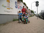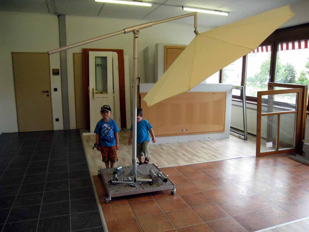 · Was soll man sagen, kaum haben wir einen Schirm, schon ist die Sonne weg. Wirklich blöd aber auch :( · Wir haben ihn dann aber doch noch aktiviert, damit die Mama am Computer die Augen nicht so zusammenzwicken muss. Außerdem ist es dann darunter auch ein bisserl wärmer und ein Belastungstest bei Wind war sowieso Not. · Zu Mittag gab es dann noch einen Ausflug mit Scooter und Dreirad zum Ströck. Man gönnt sich ja sonst nix :) |