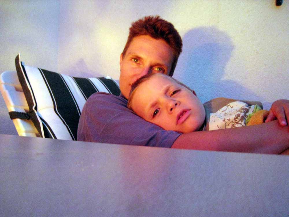 · Papap war gleich in der Früh beim Kika gestellt und hat mit unserem Lastauto den Schirm abgeholt. Anschließend schnell aufgestellt und mit den Platten fixiert und nix wie ab ins Bad. · Natürlich war heute das Wetter nicht so super wie gestern, aber doch auch sehr fein. · Blöderweise wurde der Michi dann auch noch von einer Biene gestochen. Anfangs war das Geschrei groß, aber erstaunlicherweise hat sich der Michi schnell beruhigt und das Ganze dann überraschend locker weggesteckt. · Um 6 Uhr waren wir dann aber doch wieder daheim, weil sich der Himmel mit Wolken gefüllt hat und meine Eltern doch auch noch den Schirm testen wollten. Das war dann aber gar nicht notwendig, weil sich die Sonne versteckt hielt ;( · Aber auch so war es wieder das Abendessen im Freien zu genießen. · Michi ist dann auch wieder von einer Sekunde auf die andere bei der Mama eingeschlafen :) Mich musste die Mama aber doch ins Schlafzimmer begleiten - so alleine mag ich gar nicht einschlafen. |